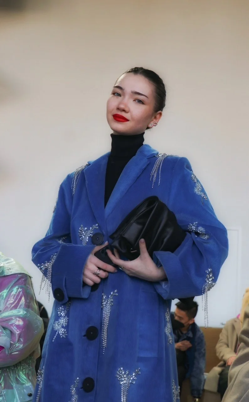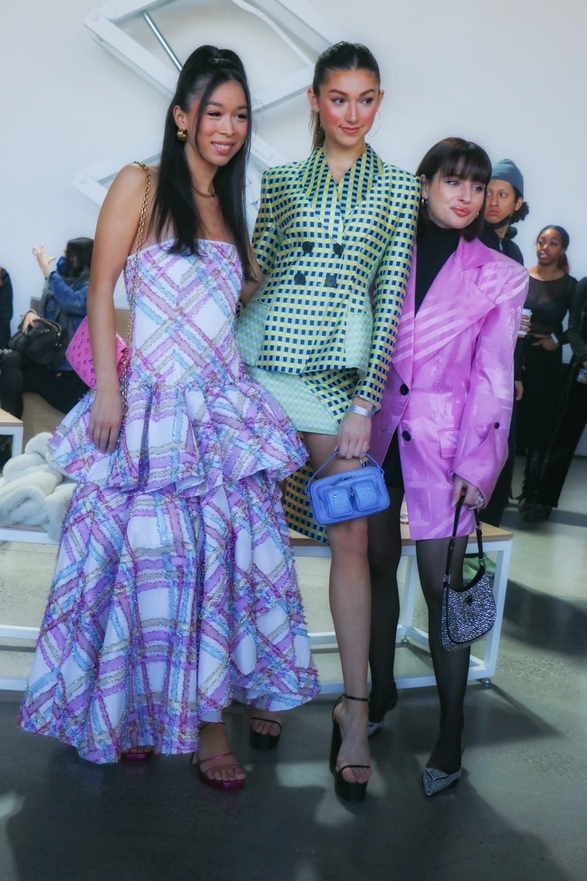 Amongst the vibrant, bubble-gum fun energy of Claudia Li's collection, guests dazzled in stylish outfits including pieces from Li’s previous SS22 collection. YouTuber-influencer Ashley aka Bestdressed enchanted the space with soft snow-ready winter wear. Pop band Japanese Breakfast's Michelle Zauner, influencer Lauren Wolfe, and model Mika Benabs floored the room styled in cotton candy-colored complimentary dresses by Claudia Li, with an outfit repeat situation between Wolfe and Benabs. Nonetheless, both women laughed it off and got photographed together. Dancer-singer Asia Monet Ray stunned in a gold and white look, completed with a pearl-beaded handbag, and model-artist Aya Shalkar charmed with a diamond-detailed cobalt coat, black leather bag, and bold red lips. Spring Studios complemented Li’s collection greatly. A giant floor and ceiling windows illuminated the show, accompanied by a whimsical soundtrack. Everything ran smoothly until people rushed backstage to be photographed with Claudia Li herself.