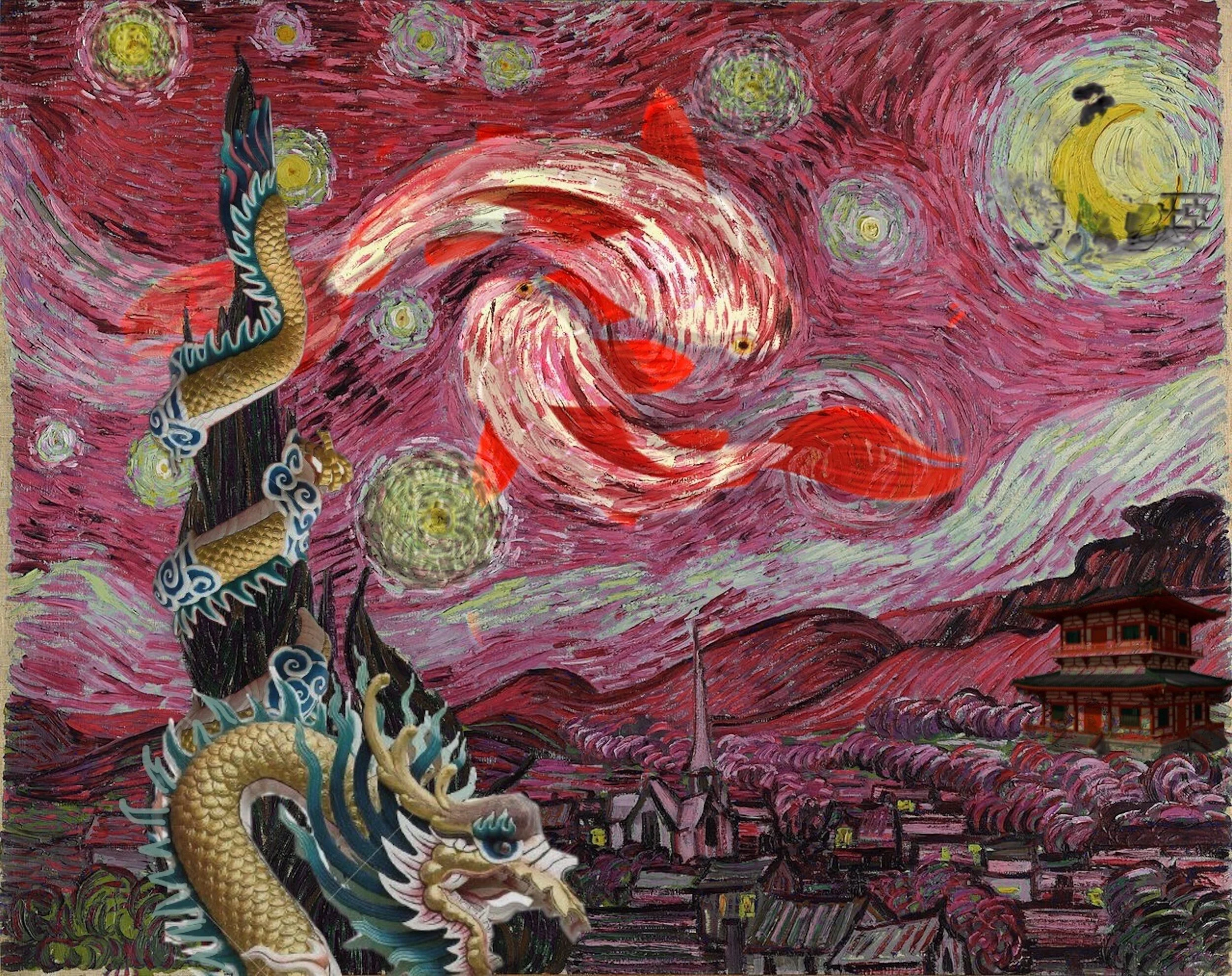 Over quarantine, I got back into graphic design and most of my inspiration stemmed from the concept of adding modernity to traditional artwork. When I was thinking about what to do with Van Gogh's Starry Night, I immediately pictured two koi fish swimming in the middle of the frame. This blossomed into my Asian-inspired rendition of the traditional piece that transforms a blue-hued night scene into a loudly oriental celebration of culture. I'm proud to say it pays homage to my heritage.